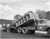 Viking 60 truck, with a Natchez floating axle 10-yard dump body mounted on the truck frame, unloads 14-tons